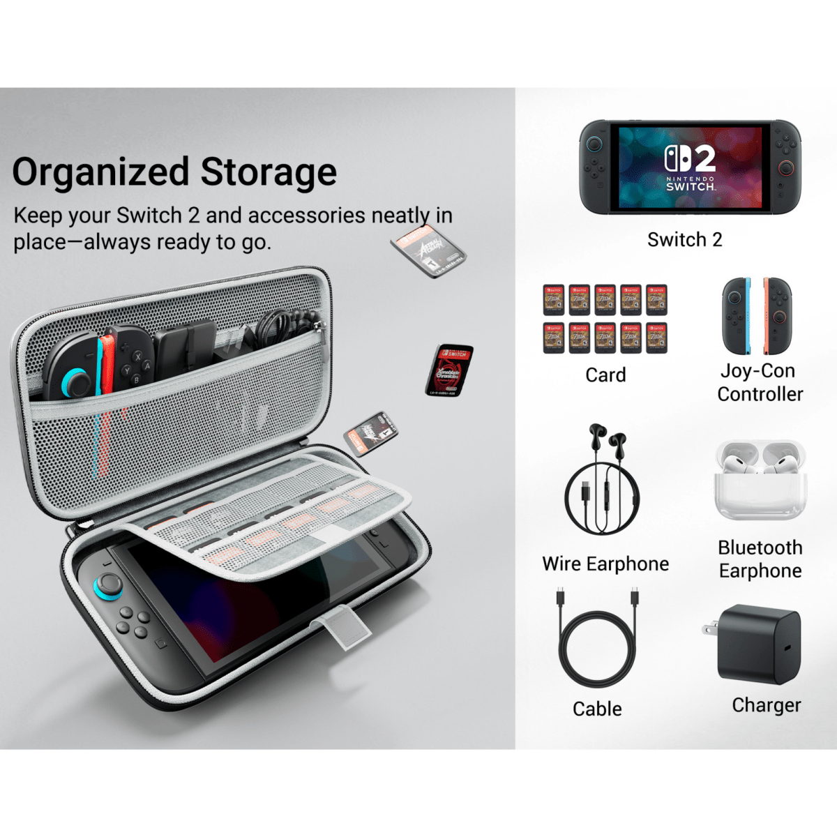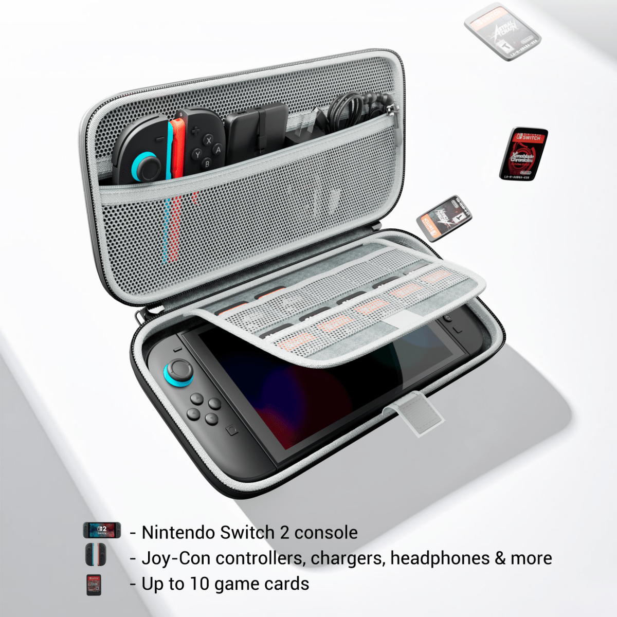 Premyslená organizácia - flexibilná kapsa na príslušenstvo (Joy-Con, nabíjačka, powerbank, slúchadlá) a držiak na 10 hier.
